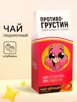 Чай «Противогрустин» — это «скорая помощь» для тех, кому срочно требуется подзарядка оптимизмом. В каждой чашке этого напитка заключена идеальная пропорция: 45% позитива и 55% чистой радости. Насыщенный вкус черного чая в сочетании с ярким ароматом спелой клубники мгновенно прогоняет хандру и создает атмосферу праздника. Креативная упаковка с веселым персонажем делает этот чай отличным подарком, способным вызвать улыбку даже в самый пасмурный день.