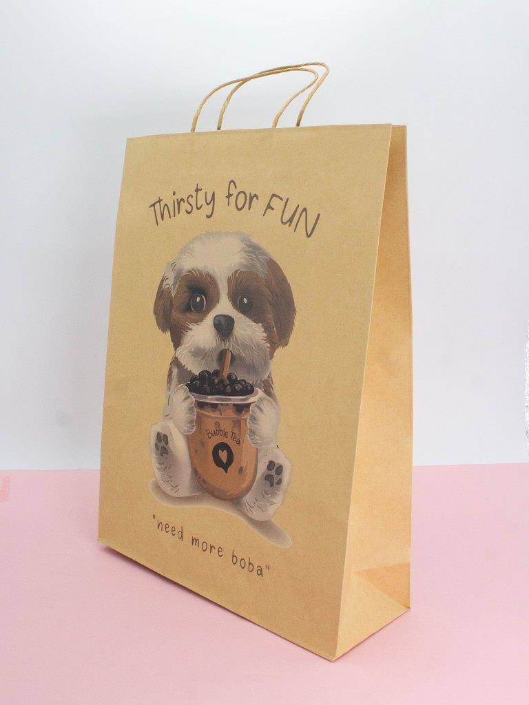 Сделайте ваш подарок еще более теплым и душевным с помощью экологичной крафт-упаковки. Центром дизайна стал очаровательный щенок, наслаждающийся популярным напитком бабл-ти. Ироничные надписи «Thirsty for FUN» и «need more boba» превращают обычный пакет в стильный аксессуар, который точно вызовет улыбку у получателя.