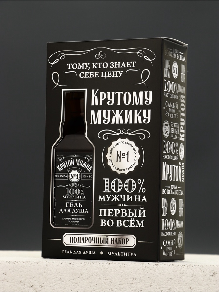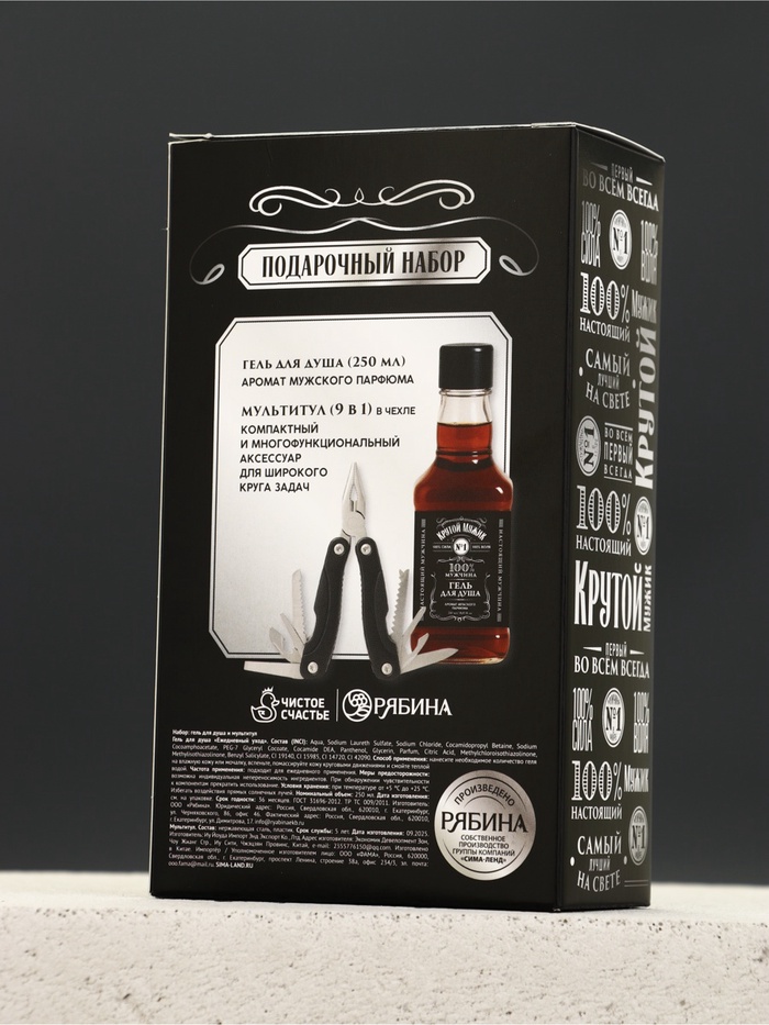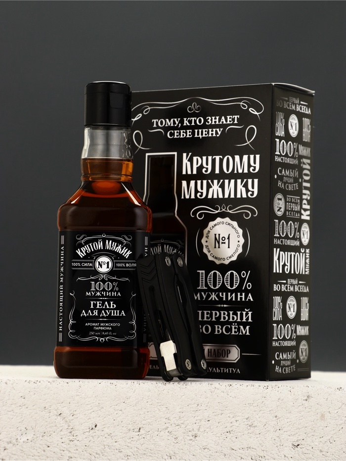 Подарок для тех, кто готов к любым вызовам! Подарочный набор «Крутому» — это грамотное сочетание стиля и пользы. В комплект входит парфюмированный гель для душа (250 мл) в уникальном дизайне, имитирующем бутылку классического крепкого напитка. Его глубокий аромат подчеркивает уверенность и дарит свежесть после тяжелого дня. Главная особенность набора — компактный черный мультитул 9 в 1. Этот надежный инструмент объединяет в себе плоскогубцы, нож, отвертки и другие необходимые функции, которые выручат в автомобиле, в походе или в быту. Набор отмечен золотой медалью InterCHARM 2024, что подтверждает высокое качество косметического производства.